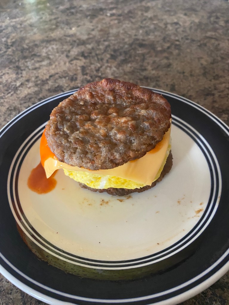 2-Frozen Sausage paddies, 2-Eggs, 1-sliceAmerican Cheese and Frank’s RED Hot Sause.